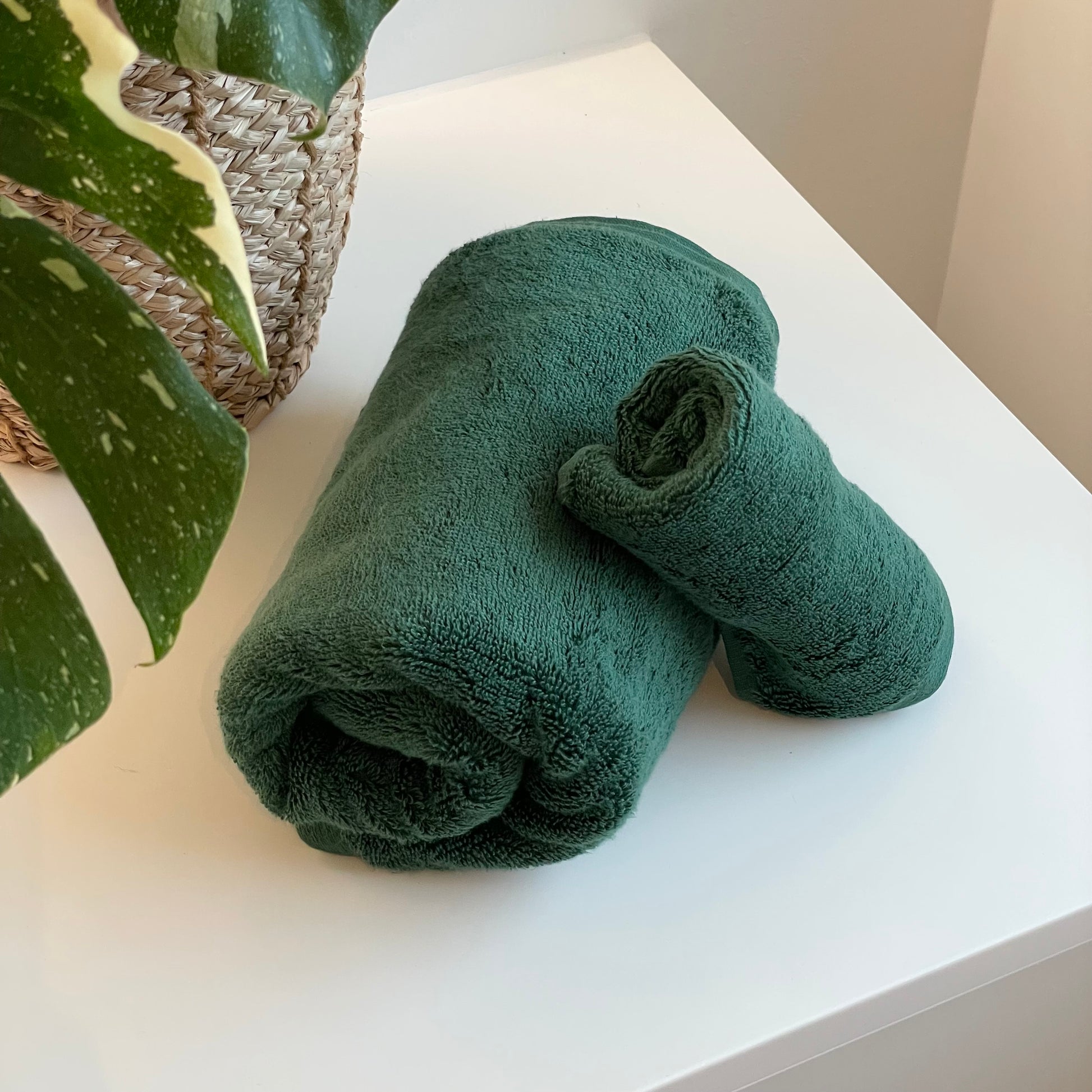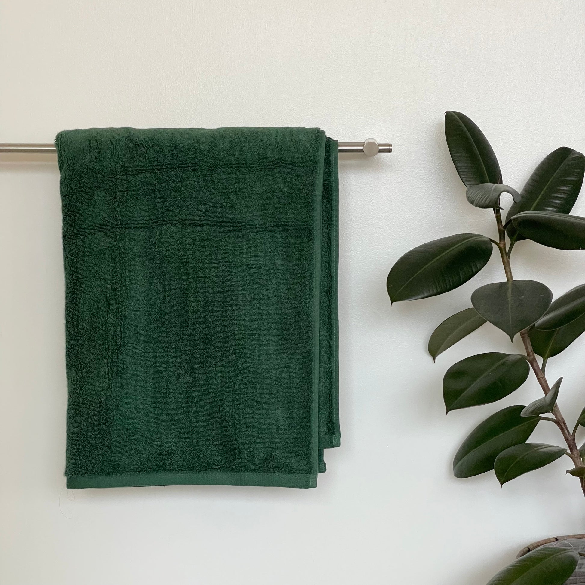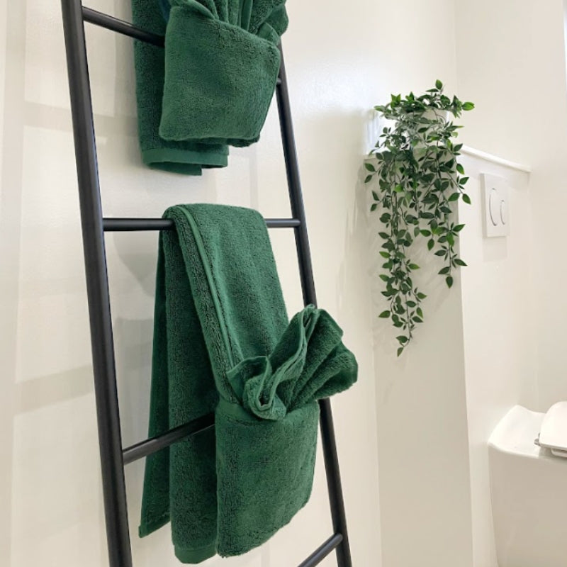 Få spa-fornemmelsen hjem med vores store Forest Deep badehåndklæde — skabt til dig, der sætter pris på ro, velvære og naturens dybe farvetoner. Den mørkegrønne nuance giver et eksklusivt og afslappet udtryk på badeværelset, mens den tætte vævning i 100% langfibret, hæftet bomuld sikrer en luksuriøs og absorberende oplevelse efter badet.