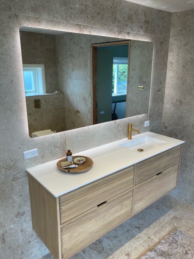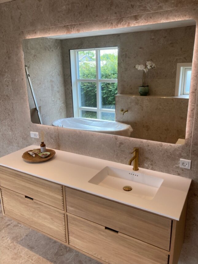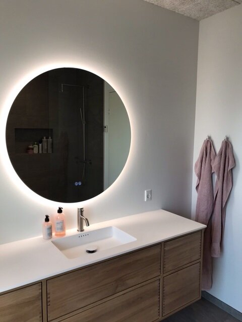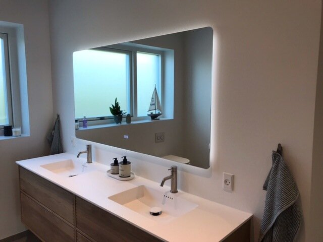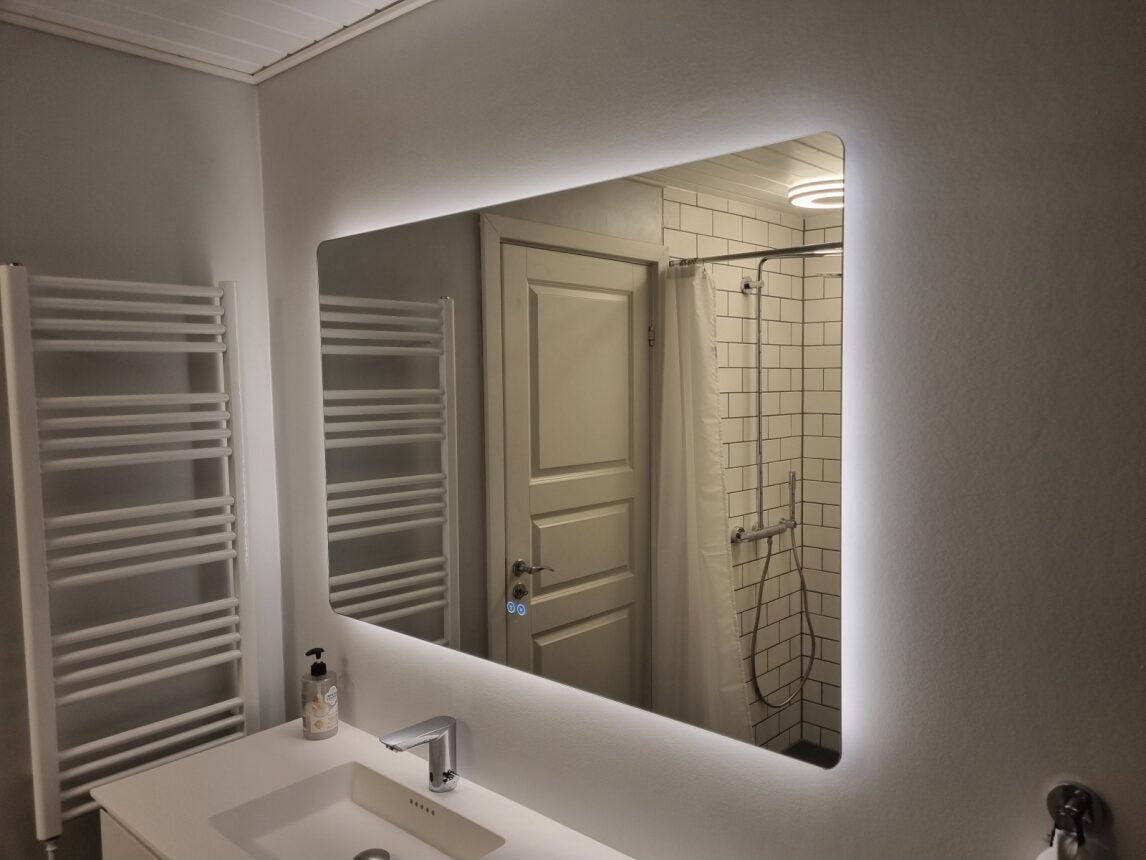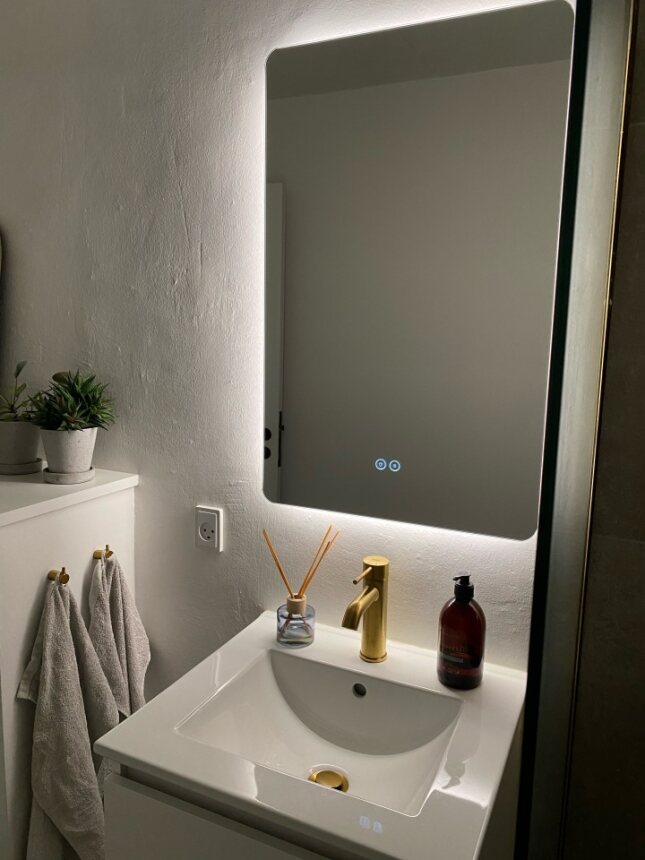 Man kan nemt selv aktivere antidug funktionen i spejlet. Det gøres med 1 enkelt tryk når lyset er tændt. Vi har valgt at antidug funktionen i spejlet ikke skal tænde automatisk sammen med lyset i spejlet, da du langt fra hver gang har brug for antidug funktionen. Derfor aktiveres denne funktion kun når du har brug for den. Dermed bruger spejlet ikke unødig strøm, hvilket også er godt for din strømregning.