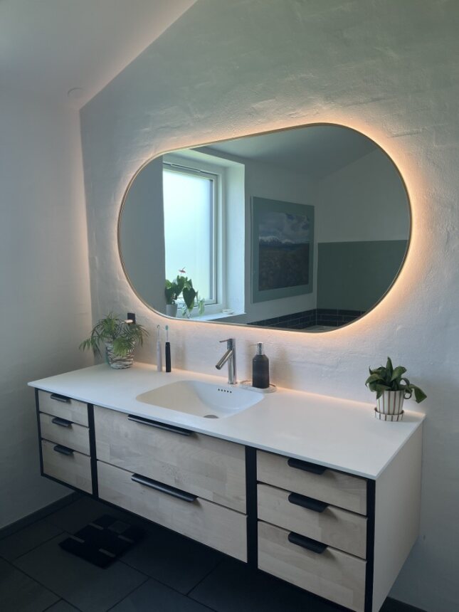 Ja, det er muligt – vi anbefaler at tilkøbe et vinkelstik, hvis du ønsker at tilslutte spejlet direkte til lampeudtaget. På den måde kan du klippe og afisolere i dette stik uden at miste garantien. For at bevare garantien må der ikke klippes i den fastmonterede ledning – brug i stedet det tilkøbte stik eller et lignende stik, som kan afisoleres og tilsluttes.