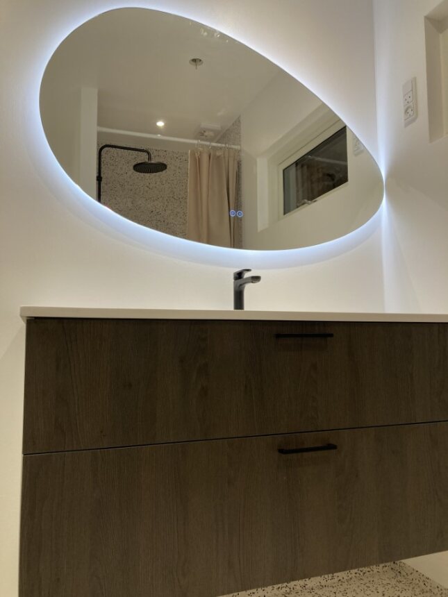 Det asymmetrisk spejl med LED lys fra Spejlshoppen.dk, er et stilfuldt spejl til badeværelset, eller hvor man ønsker at hænge det. Spejlet har en antidug funktion, hvilket betyder at du kan tænde for varmen i spejlet når du er i bad, og så dugger spejlet ikke.