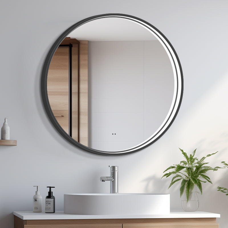Rundt Spejl med LED-lys i Ramme og Antidug Ø90, Sort Ramme