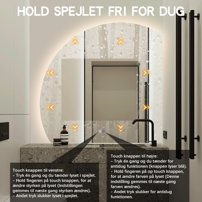 Man kan nemt selv aktivere antidug funktionen i spejlet. Det gøres med 1 enkelt tryk når lyset er tændt. Vi har valgt at antidug funktionen i spejlet ikke skal tænde automatisk sammen med lyset i spejlet, da du langt fra hver gang har brug for antidug funktionen. Derfor aktiveres denne funktion kun når du har brug for den. Dermed bruger spejlet ikke unødig strøm, hvilket også er godt for din strømregning.